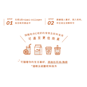 大部分市面上的膠原蛋白產品,尤其是水劑, 即使已混和了調味劑,也難以蓋過異味又增加了熱量。nippi collagen Premium免除了所有使用調味劑的必要性,更以粉劑製成,無味、無嗅,適合陪隨著你的生活喜好,加至任何冷熱飲品或食物當中(酒精及碳酸飲料除外),保證絕不影響任何味道。