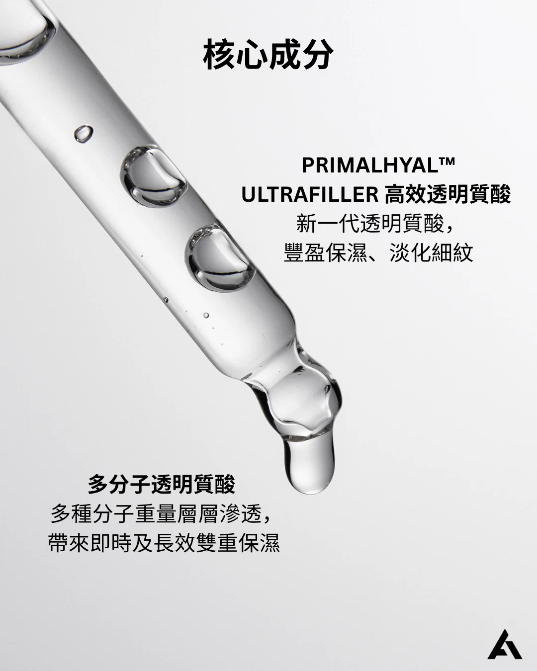 - PRIMALHYAL™ ULTRAFILLER (超填充劑™) – 新一代的透明質酸,效果像填充劑般,容易吸收,瞬間減少皺紋。同時刺激肌膚細胞的新陳代謝,促進健康膠原蛋白的生長。