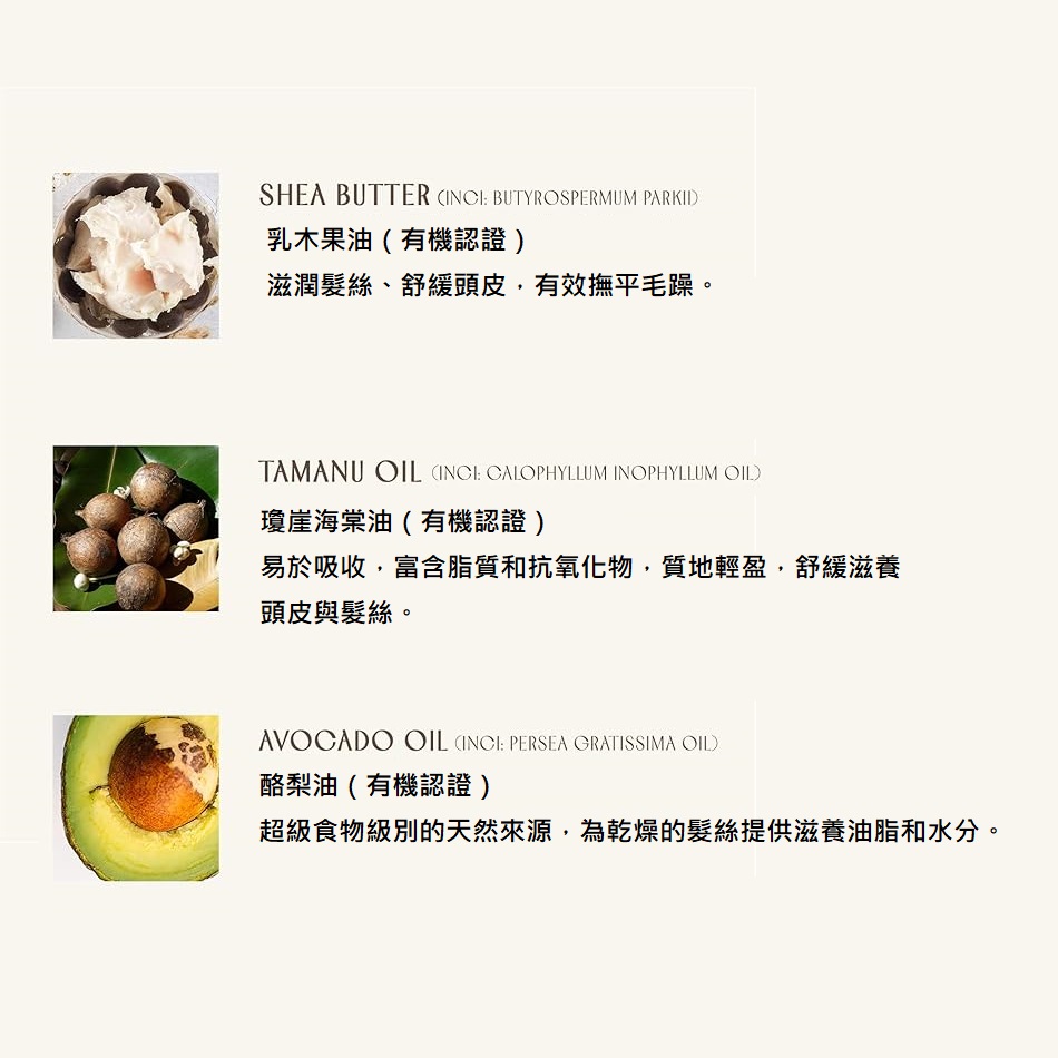 Shea Butter 乳木果油(有機認證):滋潤髮絲、舒緩頭⽪,有效撫平⽑躁。