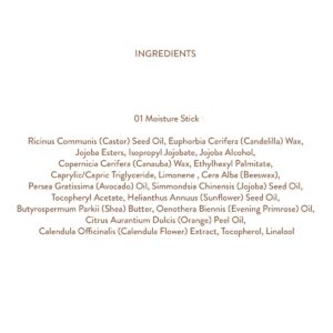 Ricinus Communis (Castor) Seed Oil, Euphorbia Cerifera (Candelilla) Wax, Jojoba Esters, Isopropyl Jojobate, Jojoba Alcohol, Copernicia Cerifera (Canauba) Wax, Ethylhexyl Palmitate, Caprylic/Capric Triglyceride, Limonene , Cera Alba (Beeswax), Persea Gratissima (Avocado) Oil, Simmondsia Chinensis (Jojoba) Seed Oil, Tocopheryl Acetate, Helianthus Annuus (Sunflower) Seed Oil, Butyrospermum Parkii (Shea) Butter, Oenothera Biennis (Evening Primrose) Oil, Citrus Aurantium Dulcis (Orange) Peel Oil, Calendula Officinalis (Calendula Flower) Extract, Tocopherol, Linalool