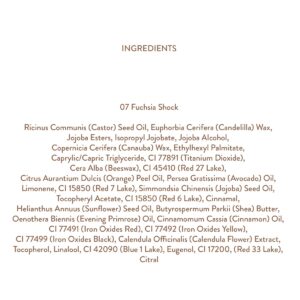 Ricinus Communis (Castor) Seed Oil, Euphorbia Cerifera (Candelilla) Wax, Jojoba Esters, Isopropyl Jojobate, Jojoba Alcohol, Copernicia Cerifera (Canauba) Wax, Ethylhexyl Palmitate, Caprylic/Capric Triglyceride, Cera Alba (Beeswax), Citrus Aurantium Dulcis (Orange) Peel Oil, Persea Gratissima (Avocado) Oil, Simmondsia Chinensis (Jojoba) Seed Oil, Tocopheryl Acetate, Helianthus Annuus (Sunflower) Seed Oil, Butyrospermum Parkii (Shea) Butter, Oenothera Biennis (Evening Primrose) Oil, Parfum (Fragrance), Tocopherol, Calendula Officinalis (Calendula) Extract, Cinnamomum Zeylanicum (Cinnamon) Leaf Oil, Cinnamomum Cassia (Cinnamon) Oil, Cinnamomum Zeylanicum (Cinnamon) Bark Oil, Limonene, Cinnamal, Linalool, Pinene, Eugenol, Beta-Caryophyllene, Citral, CI 77891 (Titanium Dioxide), CI 45410 (Red 27 Lake), CI 15850 (Red 7 Lake), CI 13850 (Red 6 Lake), CI 77491 (Iron Oxides Red), CI 77499 (Iron Oxides Black), CI 42090 (Blue 1 Lake), CI 77492 (Iron Oxides Yellow), CI 17200 (Red 33 Lake)