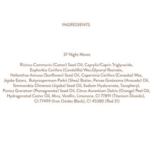Ricinus Communis (Castor) Seed Oil, Caprylic/Capric Triglyceride, Euphorbia Cerifera (Candelilla) Wax, Glyceryl Rosinate, Helianthus Annuus (Sunflower) Seed Oil, Copernicia Cerifera (Canauba) Wax, Jojoba Esters, Butyrospermum Parkii (Shea) Butter, Persea Gratissima (Avocado) Oil, Simmondsia Chinensis (Jojoba) Seed Oil, Sodium Hyaluronate, Tocopheryl, Punica Granatum (Pomegranate) Seed Oil, Citrus Aurantium Dulcis (Orange) Peel Oil, Hydrogenated Caster Oil, Mica, Vanillin, Limonene, CI 77891 (Titanium Dioxide), CI 77499 (Iron Oxides Black), CI 45380 (Red 21)